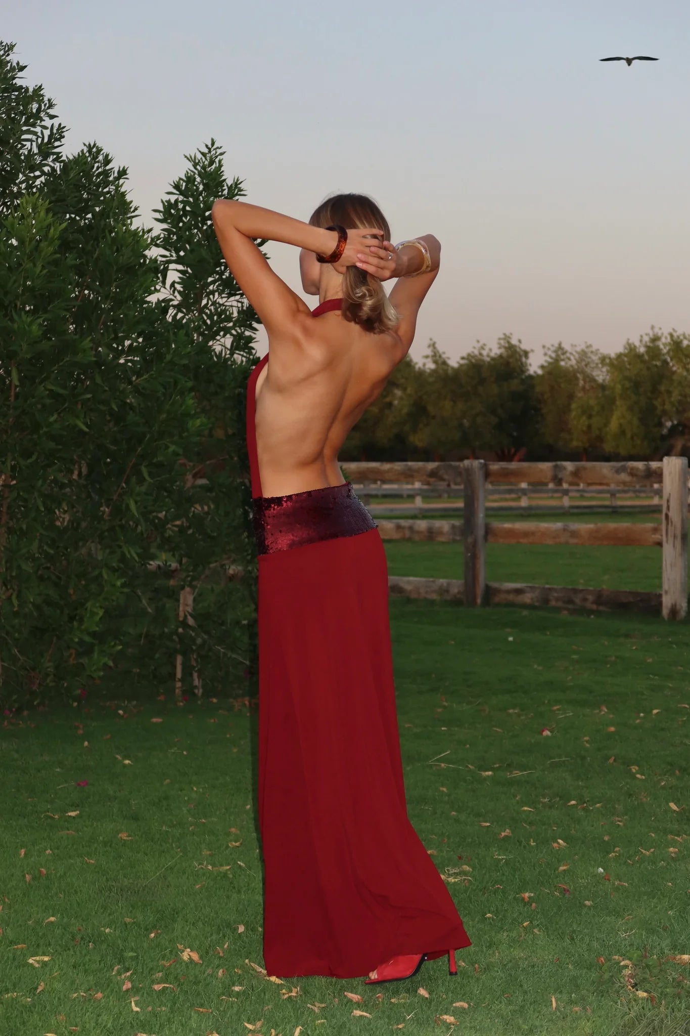 Make a statement in this stunning halter gown featuring a draped cowl-neck and an elegant open back. The sequinned waistband sits low on the hips, adding definition and a touch of glamour. The fluted skirt flows asymmetrically, creating a flattering silhouette that moves beautifully as you walk. Perfect for formal events, weddings, or red-carpet occasions, this gown exudes timeless sophistication.